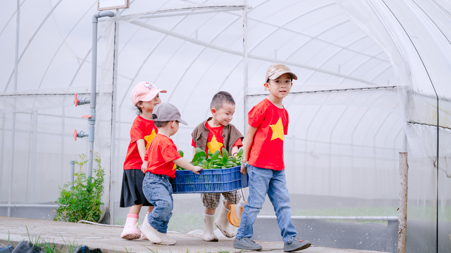 Ngay từ những bước chân đầu tiên trong khu nhà lồng, mở cữa bước vào trong, các bạn nhỏ đã mở to đôi mắt tròn xoe, ngỡ ngàng trước màu xanh mướt trải dài. Đó không chỉ là màu của rau, mà là màu của sự tươi mới, của niềm hy vọng và của một thế giới khác biệt hoàn toàn với lớp học quen thuộc hằng ngày. Những bàn tay bé xíu, vốn quen cầm bút màu hay đồ chơi, nay run run nắm lấy thân cây rau. Khi những chiếc lá đầu tiên được nhổ lên, cả khu vườn bỗng rộn ràng tiếng reo hò. Đứa trẻ nào cũng hớn hở cầm trên tay chiến lợi phẩm của mình, như vừa tìm thấy một kho báu. Khoảnh khắc ấy, niềm vui thuần khiết lan tỏa, hồn nhiên như chính ánh mắt trẻ thơ.